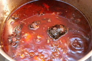 - bring to a boil, turn down to a simmer and cook until the meat is very tender but does NOT fall off the bone (2-3 hours)