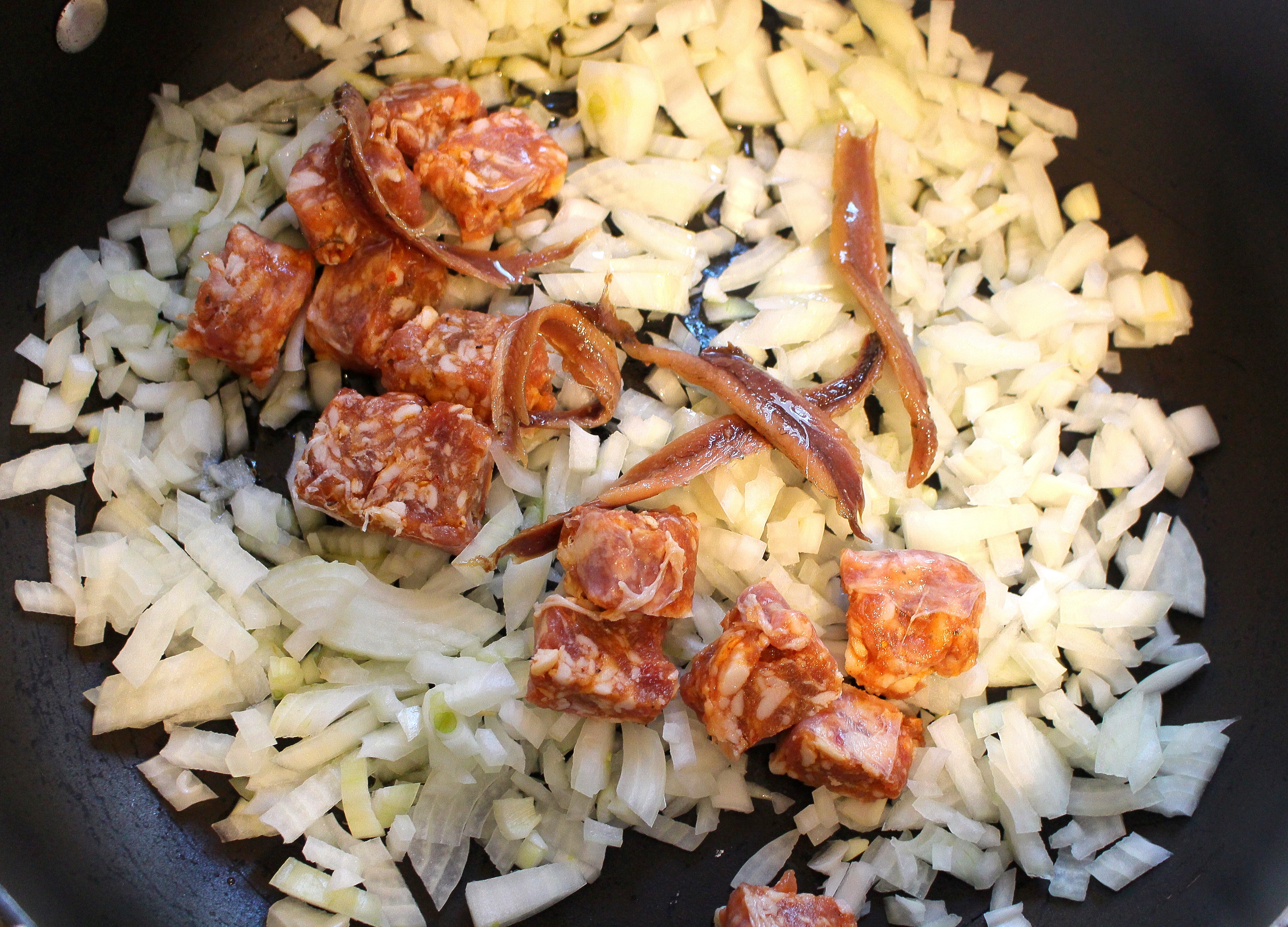 ZARZUELA DE MARISCOS (Catalan Seafood Stew) ← Previous Next → saute 1 ea large, julienned onion, 2 ea chorizo and 5 ea anchovy fillets in 1/3 cup EVO