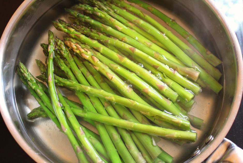 Grilled Pork Belly & Green Asparagus ← Previous Next → while the belly cooks, blanch, shock and drain fresh green asparagus, 8 oz per portion