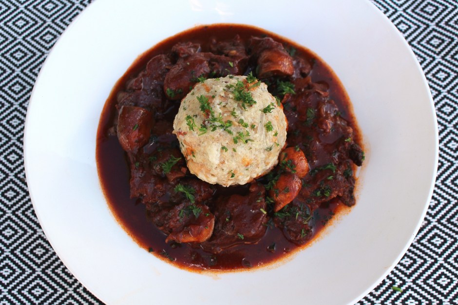 Braised Beef Neck In Merlot/Mushroom Sauce With Bread Dumpling (Geschmorter Rindernacken In Merlot/Champignon -Soße Und Semmelknödel) ← Previous Next → Braised Beef Neck In Merlot/Mushroom Sauce With Bread Dumpling (Geschmorter Rindernacken In Merlot/Champignon -Soße Und Semmelknödel)