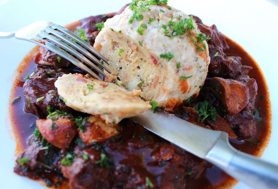 Braised Beef Neck In Merlot/Mushroom Sauce With Bread Dumpling (Geschmorter Rindernacken In Merlot/Champignon -Soße Und Semmelknödel) ← Previous Next → Braised Beef Neck In Merlot/Mushroom Sauce With Bread Dumpling (Geschmorter Rindernacken In Merlot/Champignon -Soße Und Semmelknödel)