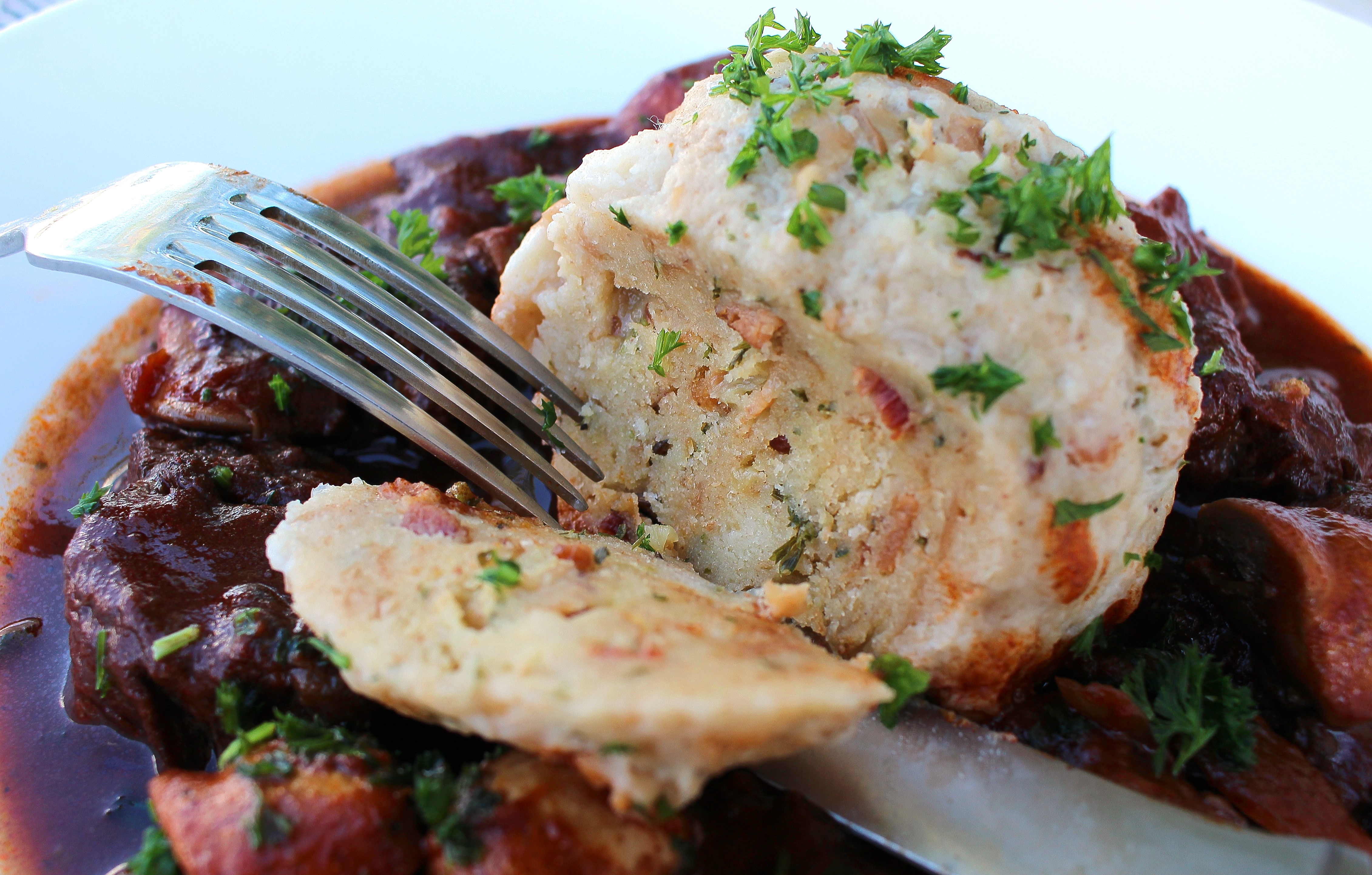 Braised Beef Neck In Merlot/Mushroom Sauce With Bread Dumpling (Geschmorter Rindernacken In Merlot/Champignon -Soße Und Semmelknödel) ← Previous Next → Braised Beef Neck In Merlot/Mushroom Sauce With Bread Dumpling (Geschmorter Rindernacken In Merlot/Champignon -Soße Und Semmelknödel)