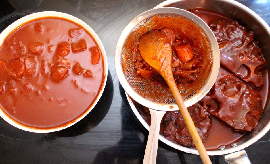 remove the meat to another pot, strain enough of the sauce for one portion, safe the rest of the sauce WITH the vegetables for another dish (these veggies are too delicious to discard)