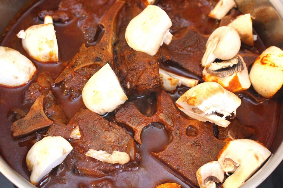 Braised Beef Neck In Merlot/Mushroom Sauce With Bread Dumpling (Geschmorter Rindernacken In Merlot/Champignon -Soße Und Semmelknödel) ← Previous Next → add one cup button mushrooms to the beef, cover, bring to a simmer, remove from heat, set aside