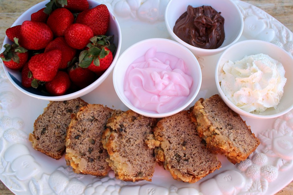 fresh strawberries, strawberry yogurt, Nutella, ready whip, banana/cranberry/walnut cake
