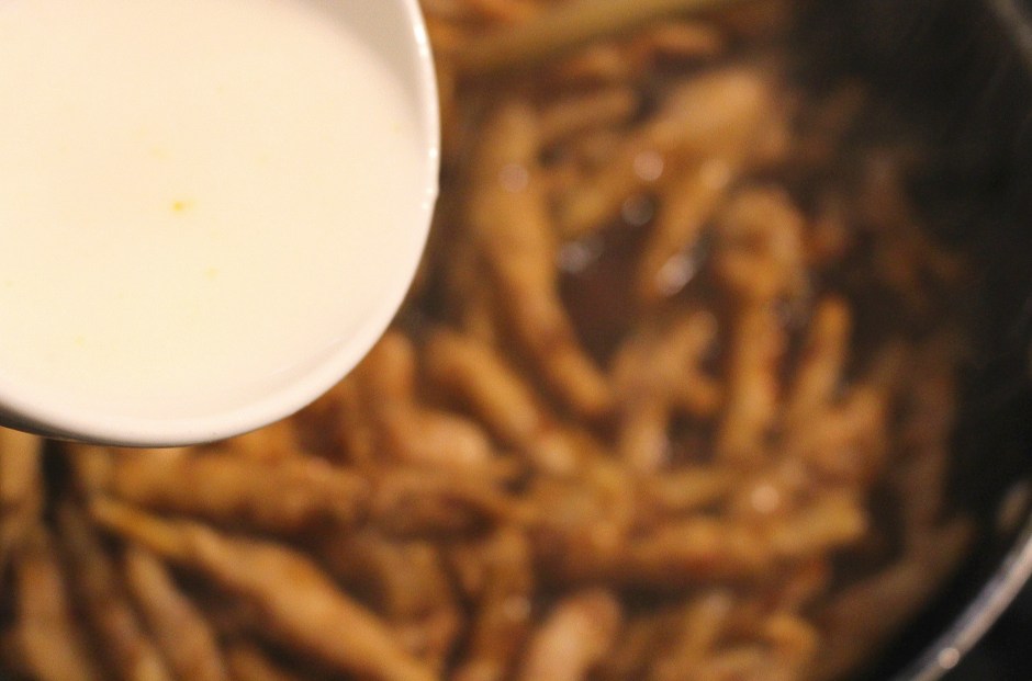 6 ← Previous Next → add enough (about 1 tblsp) corn starch slurry to thicken the sauce lightly, stir, simmer a few seconds, remove from heat check/adjust seasoning ; to serve, sprinkle with pickled chillies and sliced scallions