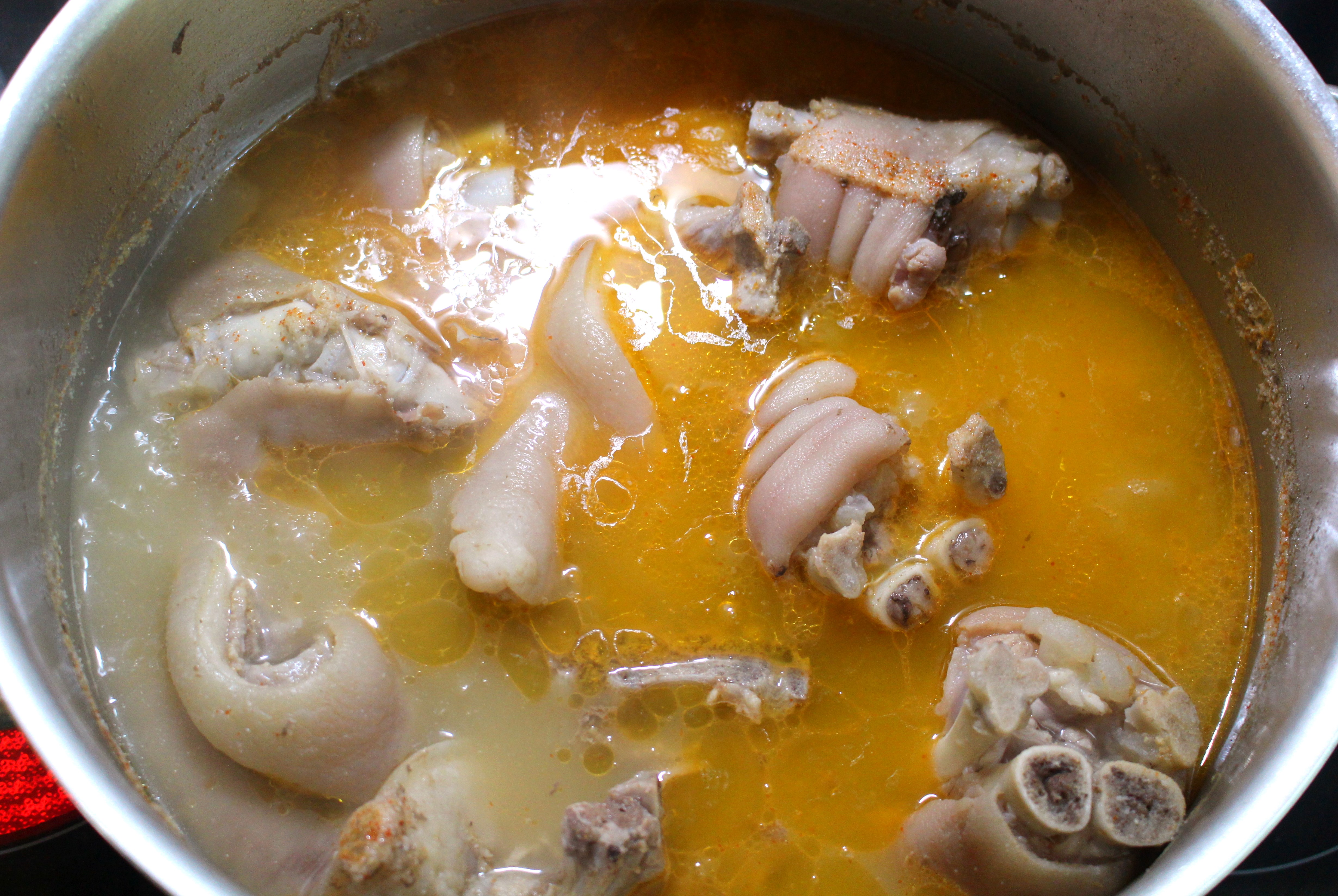Pork Congee – (猪肉粥) – (Pork Porridge) Next → simmer 5 lbs of pigs feet in lightly salted water until tender
