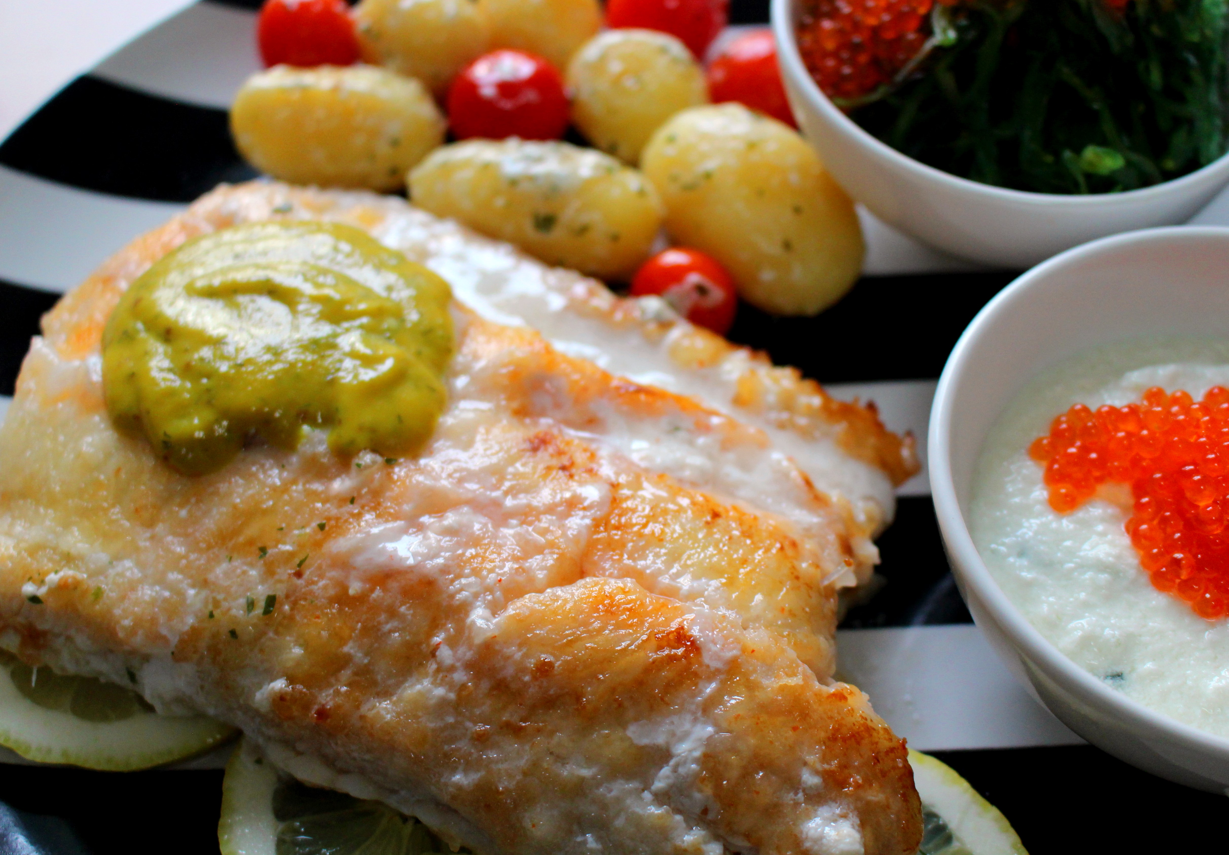Northern Wolf Fish With Dill-Honey Sauce, Garlic Potatoes, Tsatsiki & Seaweed Salad with Trout-Caviar ← Previous Next → Sautierter Steinbeißer mit Dill-Senf Sauce, Knoblauch-Kartoffeln, Tsatsiki und Seetang Salat mit Forellenkaviar