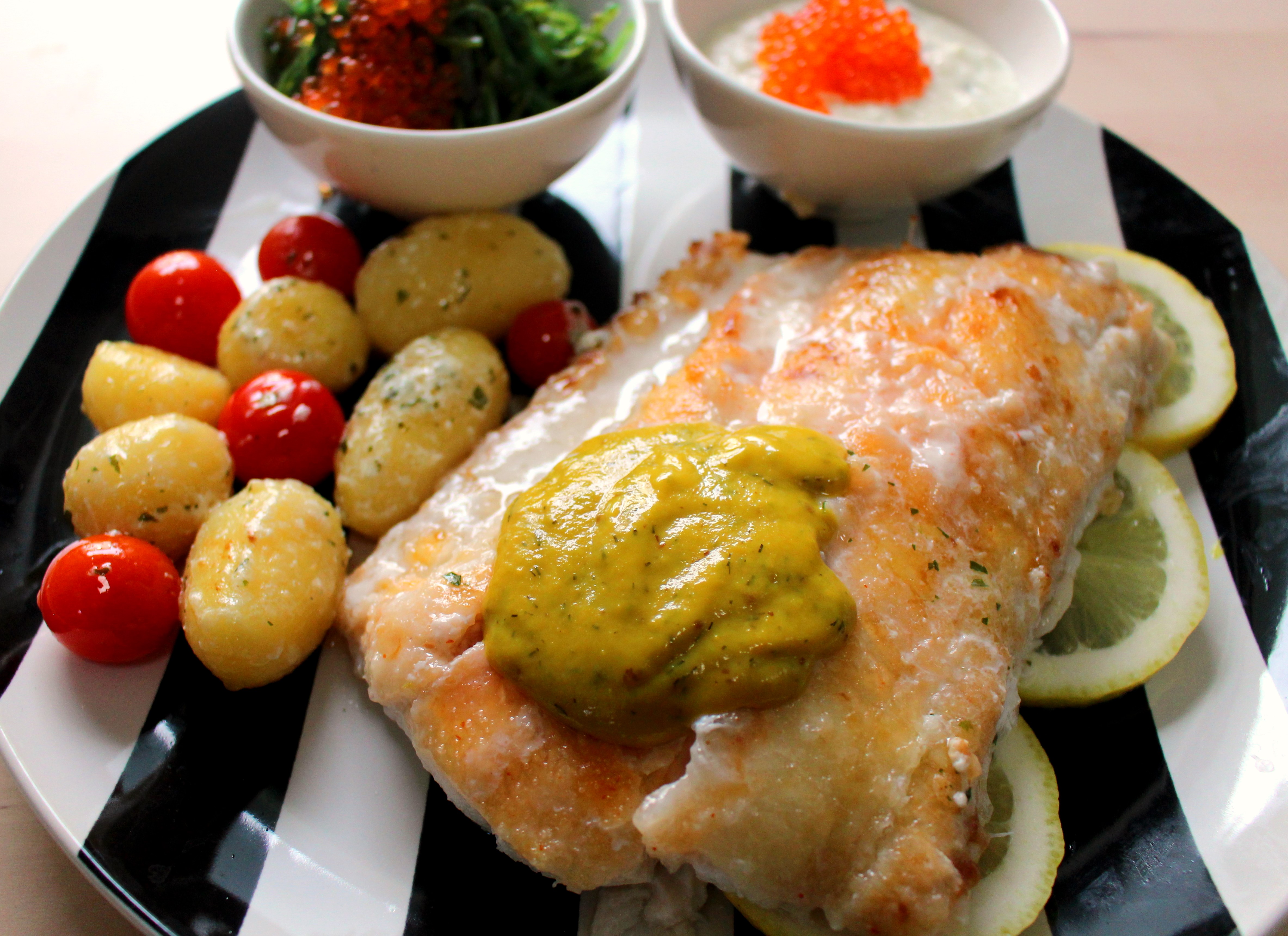 Northern Wolf Fish With Dill-Honey Sauce, Garlic Potatoes, Tsatsiki & Seaweed Salad with Trout-Caviar ← Previous Next → Sautierter Steinbeißer mit Dill-Senf Sauce, Knoblauch-Kartoffeln, Tsatsiki und Seetang Salat mit Forellenkaviar