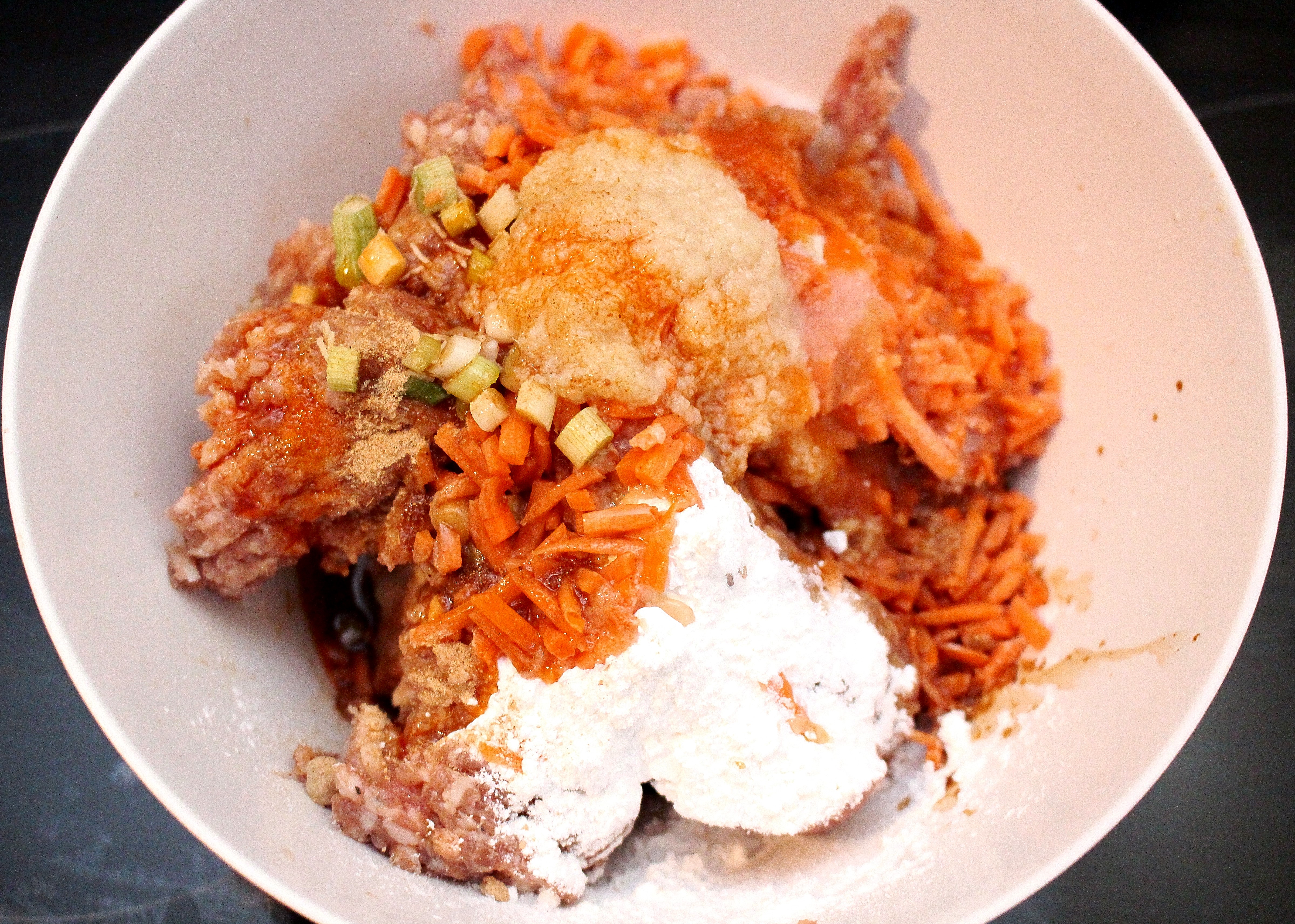 1 lb grd pork, 1/ cup finely diced carrots, 1 tblsp corn starch, 1 ea egg white, 1 tblsp toasted sesame seed oil, 1 tsp chili oil, a pinch of granulated garlic, a pinch of granulated ginger, 2 tblsp slices scallions, 2 tblsp chopped cilantro, soy sauce to taste