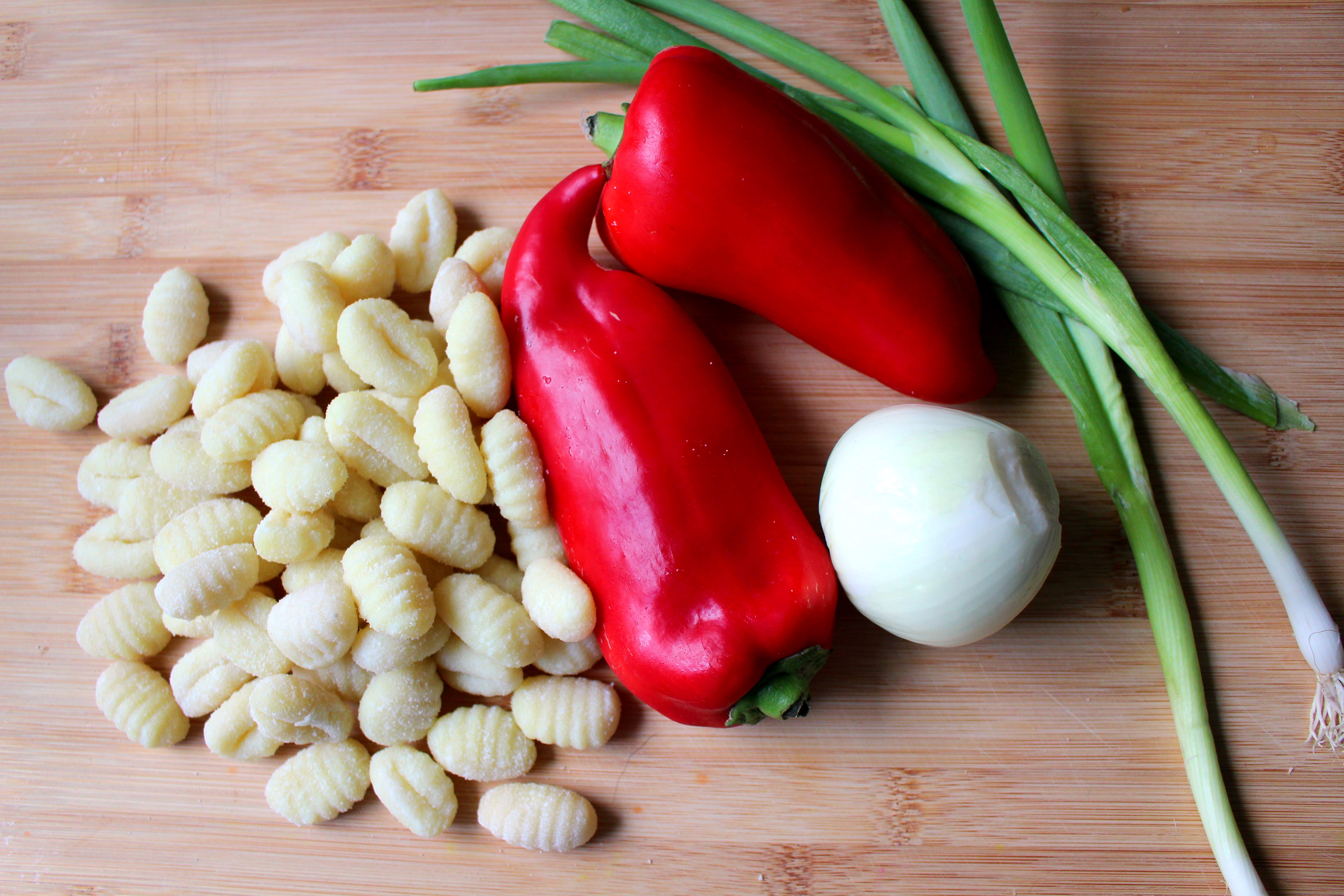 German Veal-Burger with Garlic/Herb Butter, Gnocchi, Peppers & Onion Next → 1 lb Raw Gnocchi, 2 ea red peppers, 1 ea medium size onion, 3 ea scallion