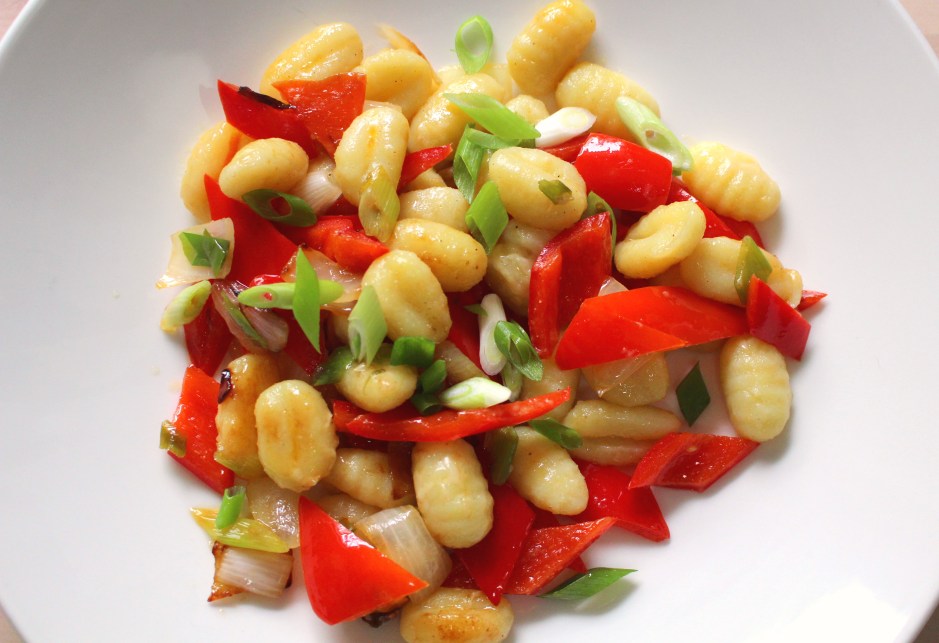 German Veal-Burger with Garlic/Herb Butter, Gnocchi, Peppers & Onion ← Previous Next → divide the gnocchi/veggies onto 4 serving plates