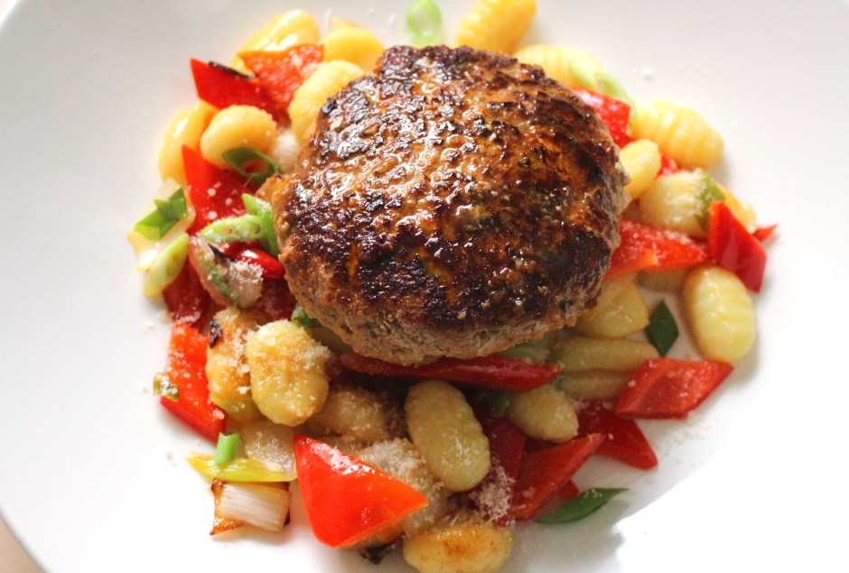 German Veal-Burger with Garlic/Herb Butter, Gnocchi, Peppers & Onion ← Previous Next → top with a veal patty each, top the patty with 1 oz garlic/herb butter