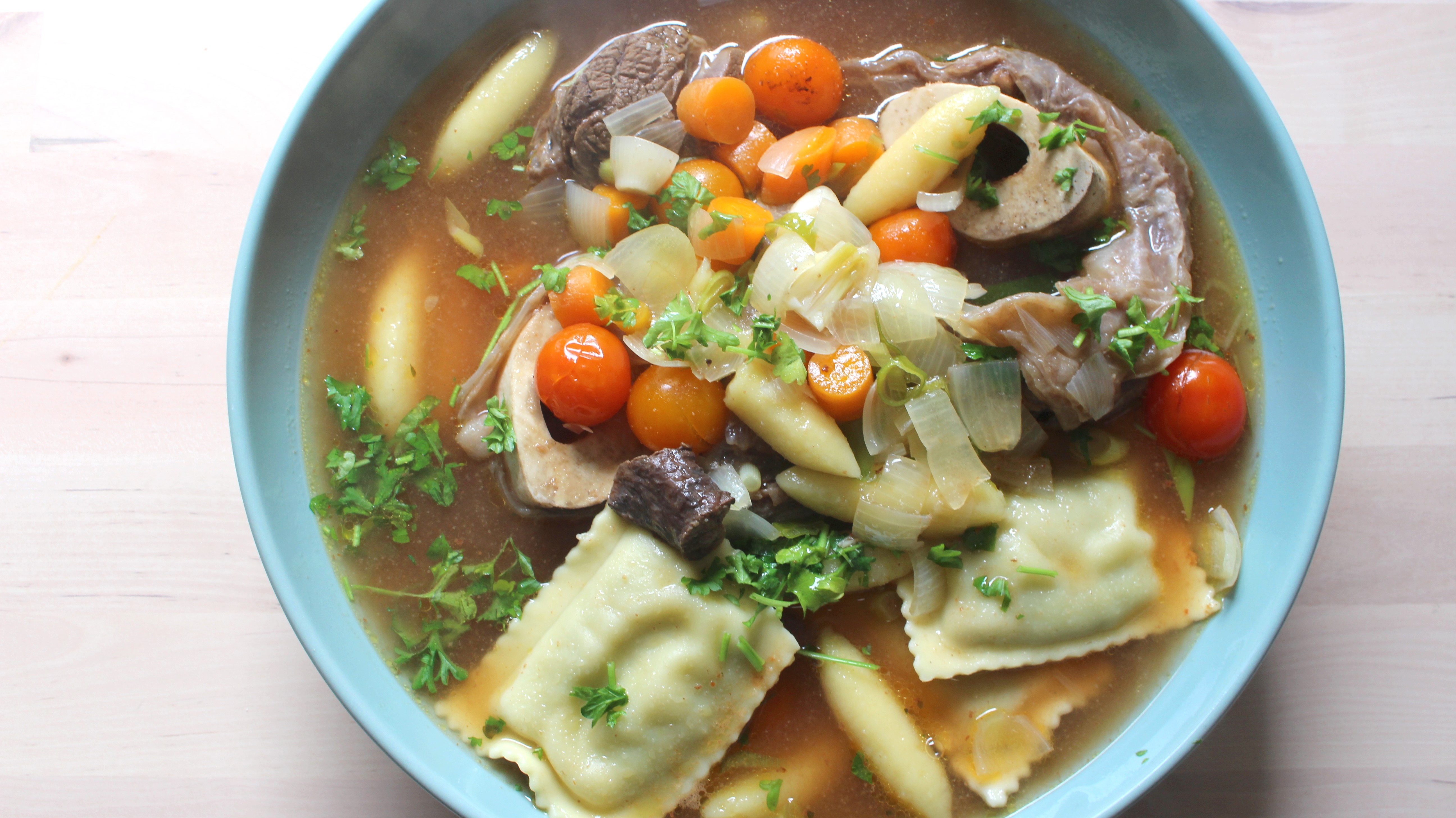 Beef Shank Soup With Pasta & Ravioli. Rindersuppe Mit Schupfnudeln & Maultaschen ← Previous Next → Beef Shank Soup With Pasta & Ravioli (Rindersuppe Mit Schupfnudeln & Maultaschen)