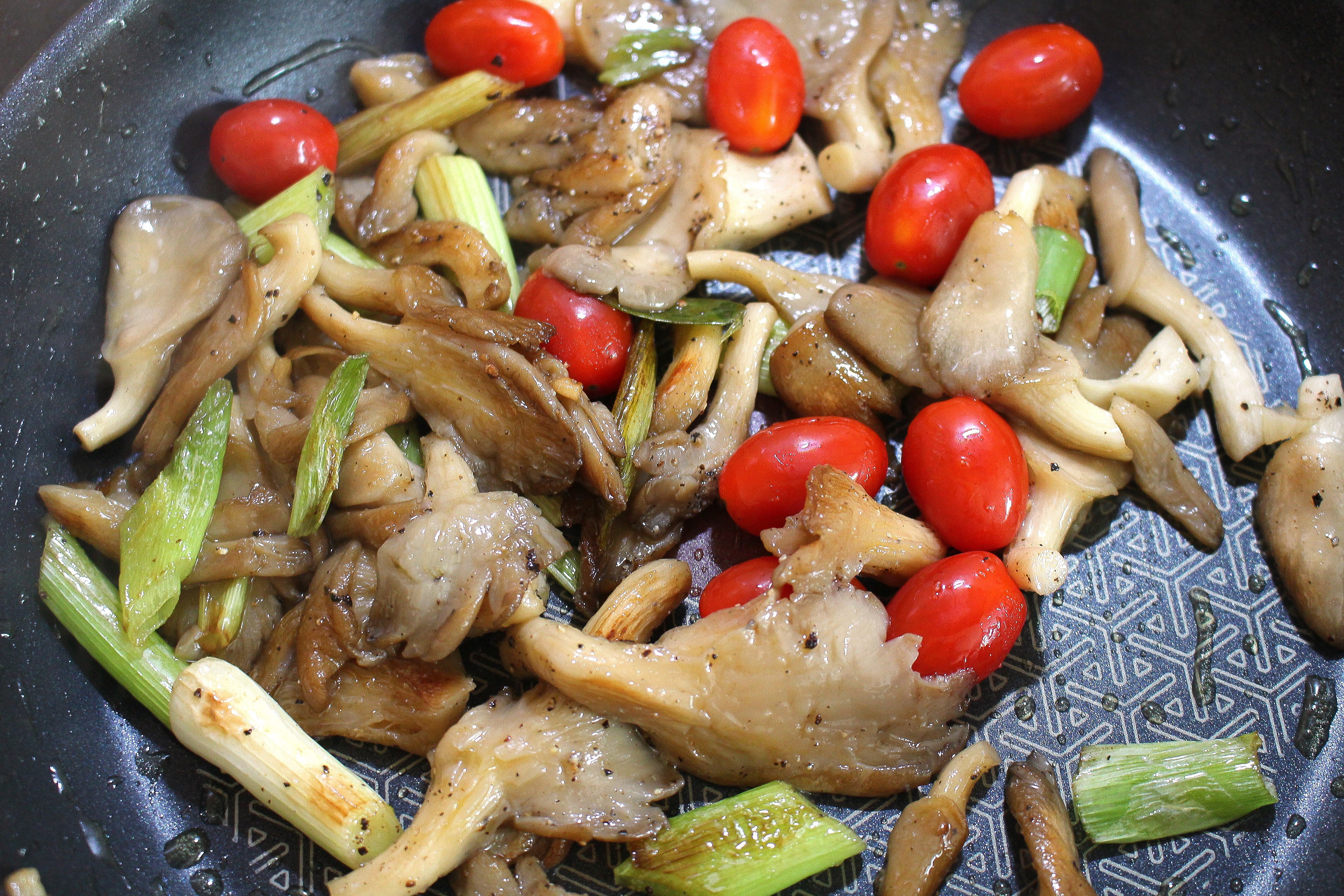 Sautéed Veal Liver with Thai Chili-Vinegar Sauce, Sautéed Oyster Mushrooms, Scallions and Grape- Tomatoes & Potato-Cucumber Salad ← Previous Next → add 10 ea grape tomatoes, season with garlic paste, kosher salt and fresh ground black pepper to tastes, sauté another minute