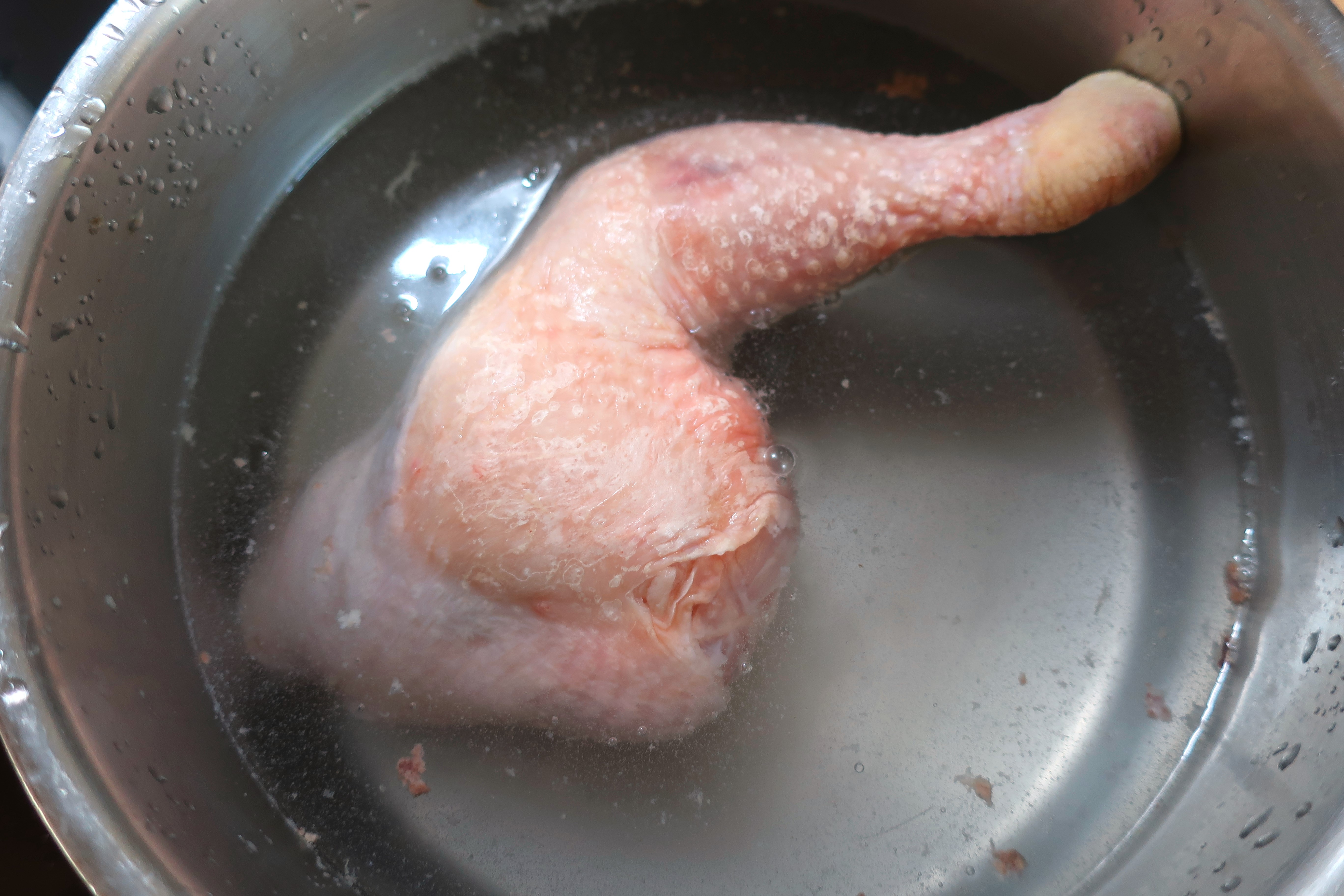 Chicken And Udon In Coconut/Chili Soup Next → for one single main course portion of soup, blanch 1 ea chicken leg in salted water, discard water, cover the leg with chicken stock, season with kosher salt, grated ginger, grated garlic, Ichimi togarashi and furikake to taste, simmer