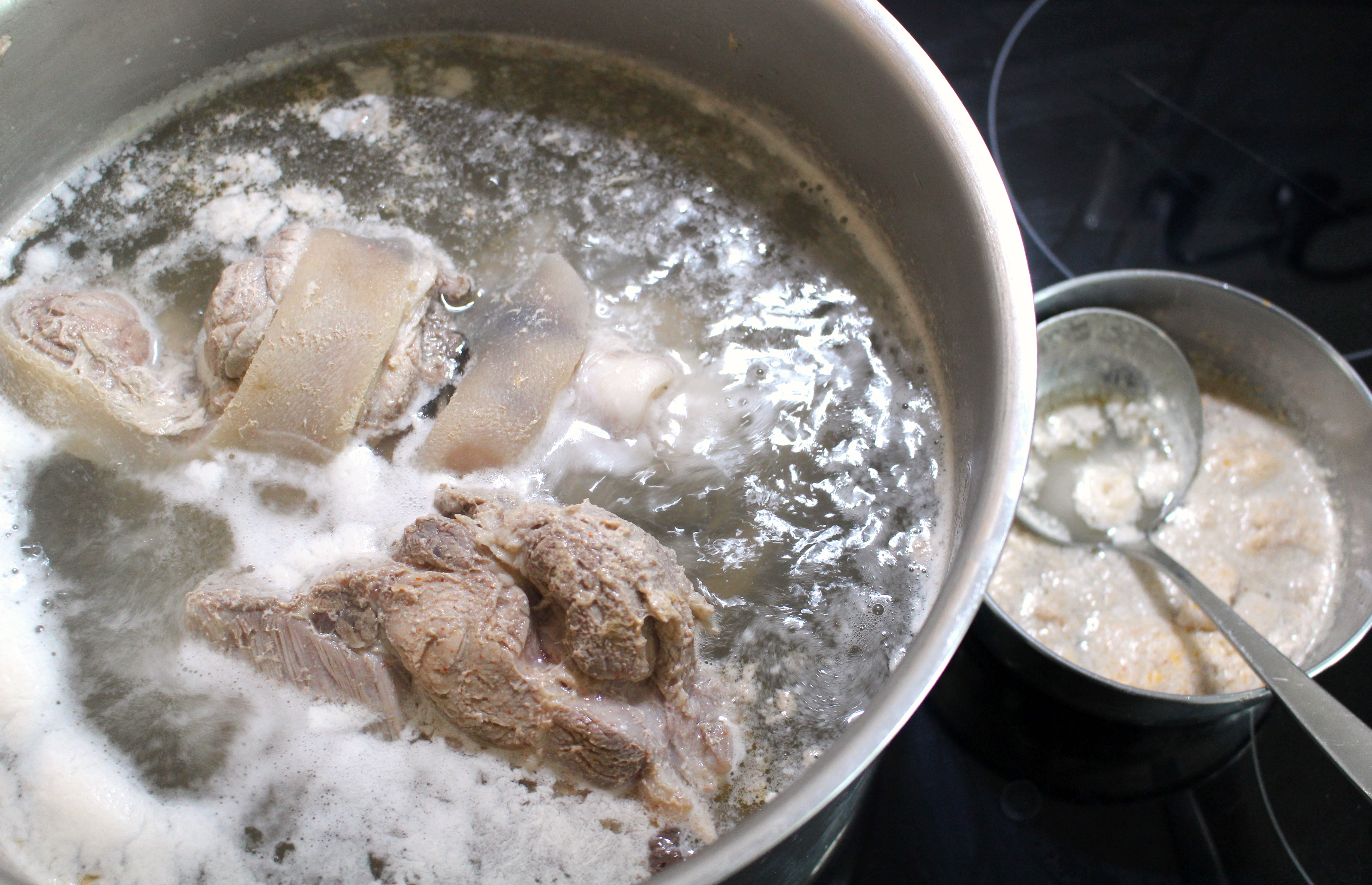 simmer 5 lbs bone-in pork (use the part you prefer for soup), 2 lbs boneless beef (use the part you prefer for soup) in 5 qt of water, lightly seasoned to taste with kosher salt, sriracha, grated garlic and ginger, until the meat is tender but not falling apart; (check the meat individually for doneness), during the simmering, remove the foam from the top frequently to ensure a clean/clear broth