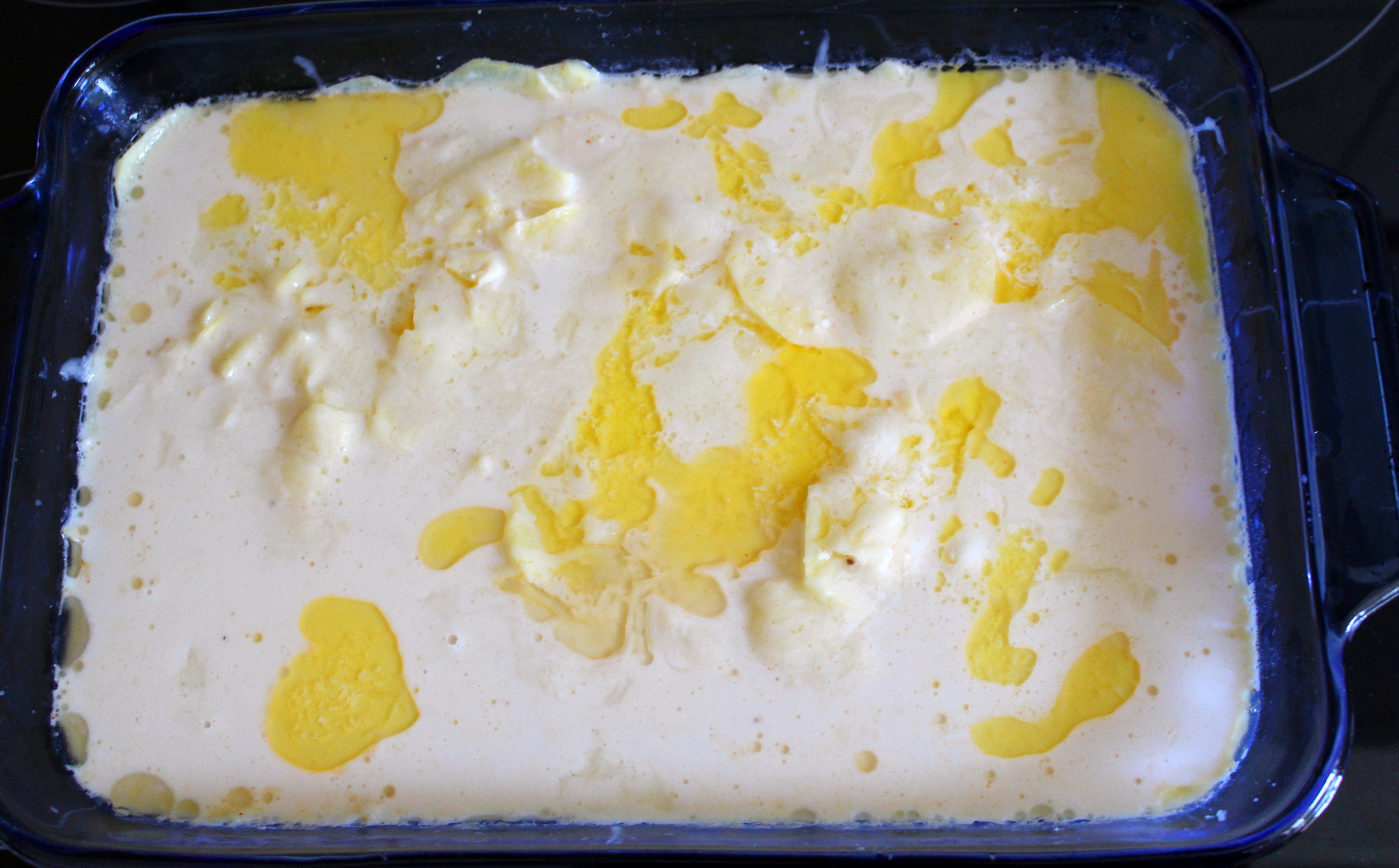 place the potatoes in a greased baking dish, add 1/2 milk, 1/2 cup heavy cream, a pinch of grated nutmeg, 1 /2 tsp dried time,, 1 oc grated parmesan, season wit kosher salt and white pepper to taste, mix well, top with another 2 oz of grated parmesan and a few small knobs of unsalted butter, bake at 320 F until golden brown and potatoes are cooked through