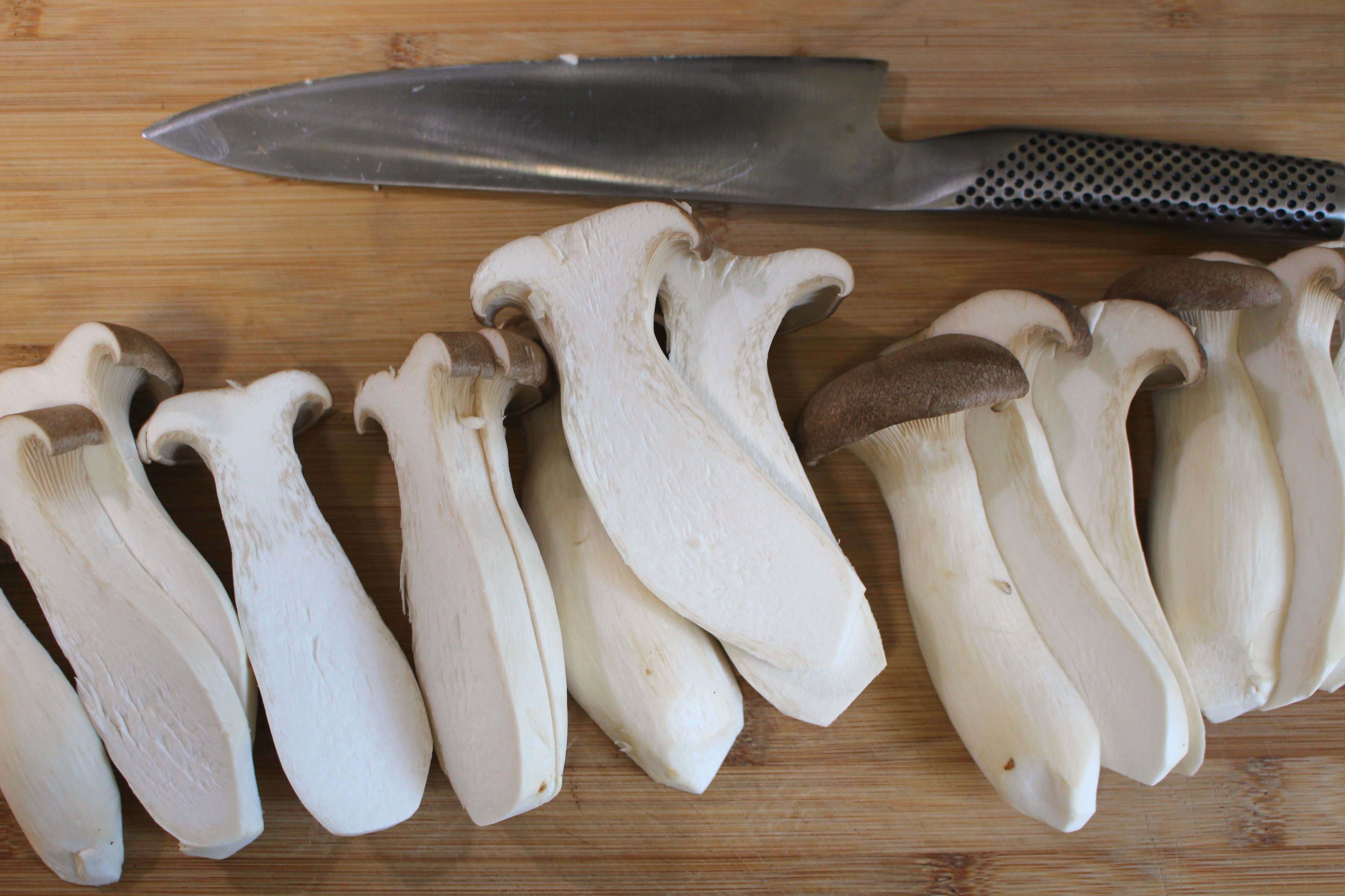Sautéed King Oyster Mushrooms with Pommes Dauphinoise (Sautierte Kräuterseitlinge mit Kartoffel-Gratin (Pleurotes Du Panicaut) ← Previous Next → slice ea mushroom into 3 equally-thick slices, saute in clarified butter on both sides, season with kosher salt and cayenne pepper