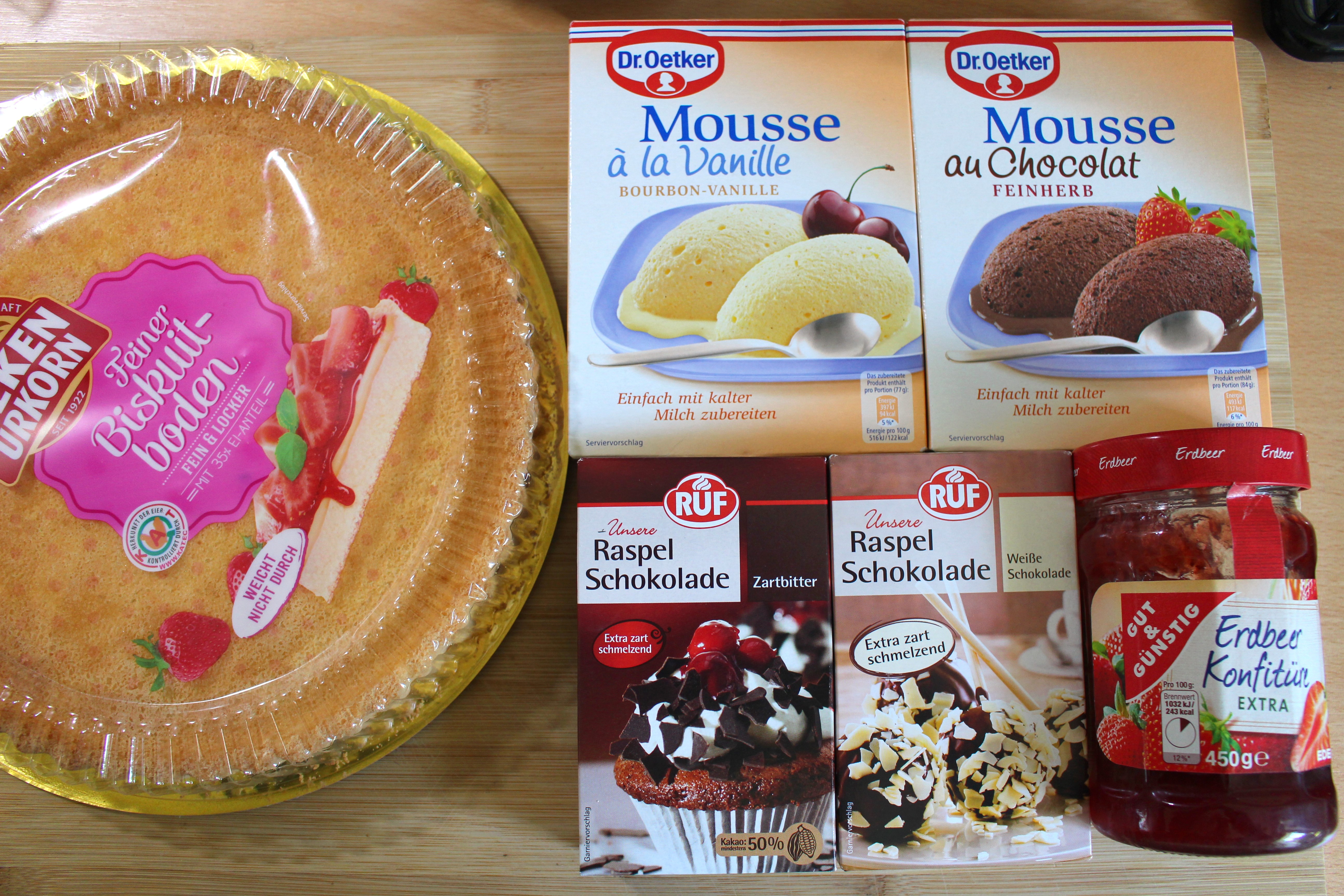 ONE FOR THE KID´S # 8– Dark and White Chocolate-Mousse Cake Next → pre-made fruit cake bottom, instant white chocolte mousse, instant dark chocolate mousse, white and dark chocolate shavings (optional) , strawberry marmalade