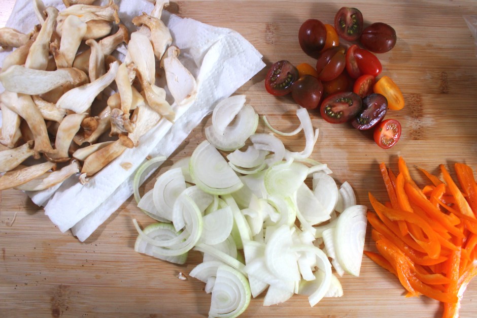 cleaned and sliced rock oyster mushrooms, sliced onions, halved grape tomatoes, sliced bell peppers