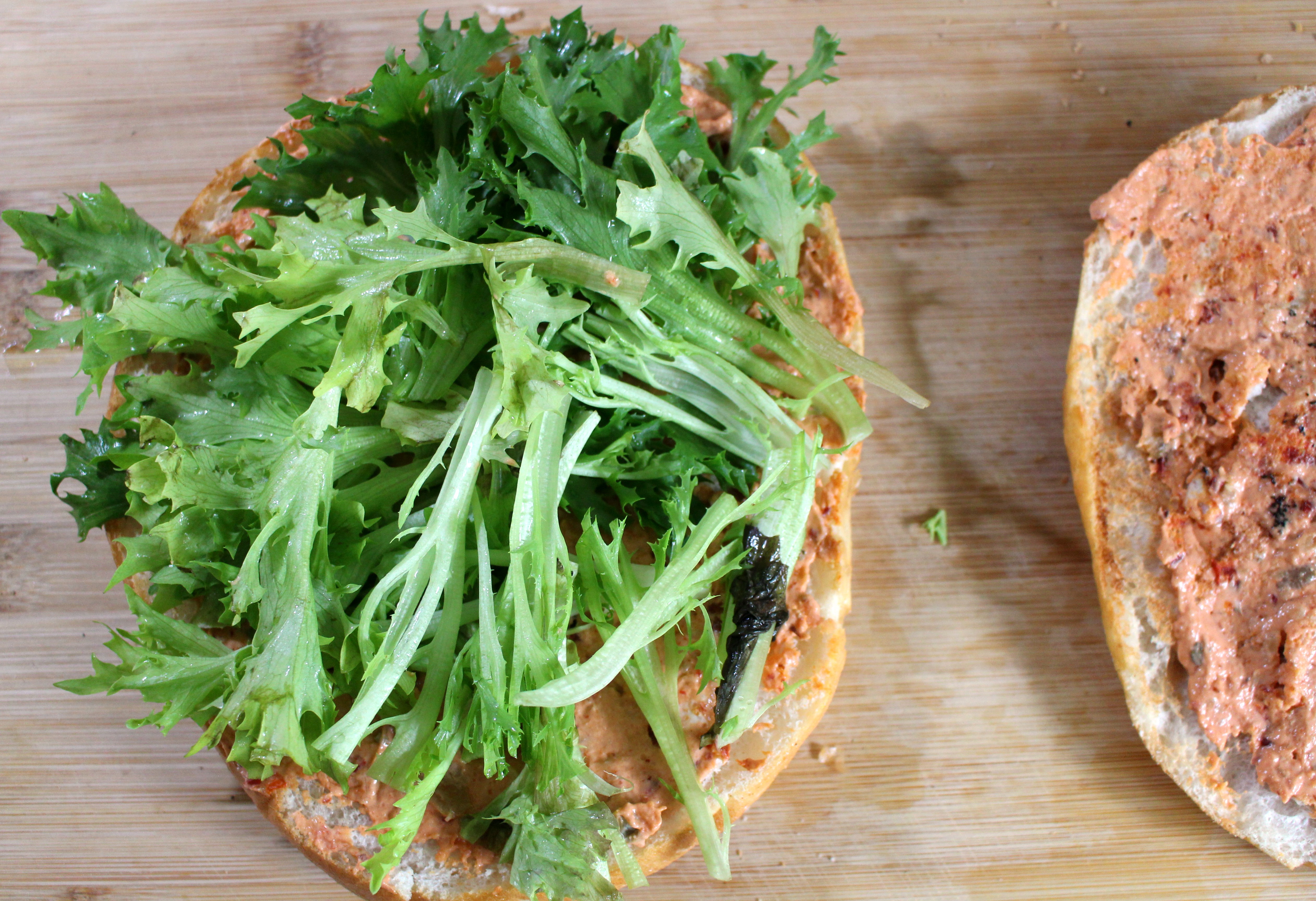 cover the bottom half of the bread with vinaigrette-dressed baby arugula or frisse