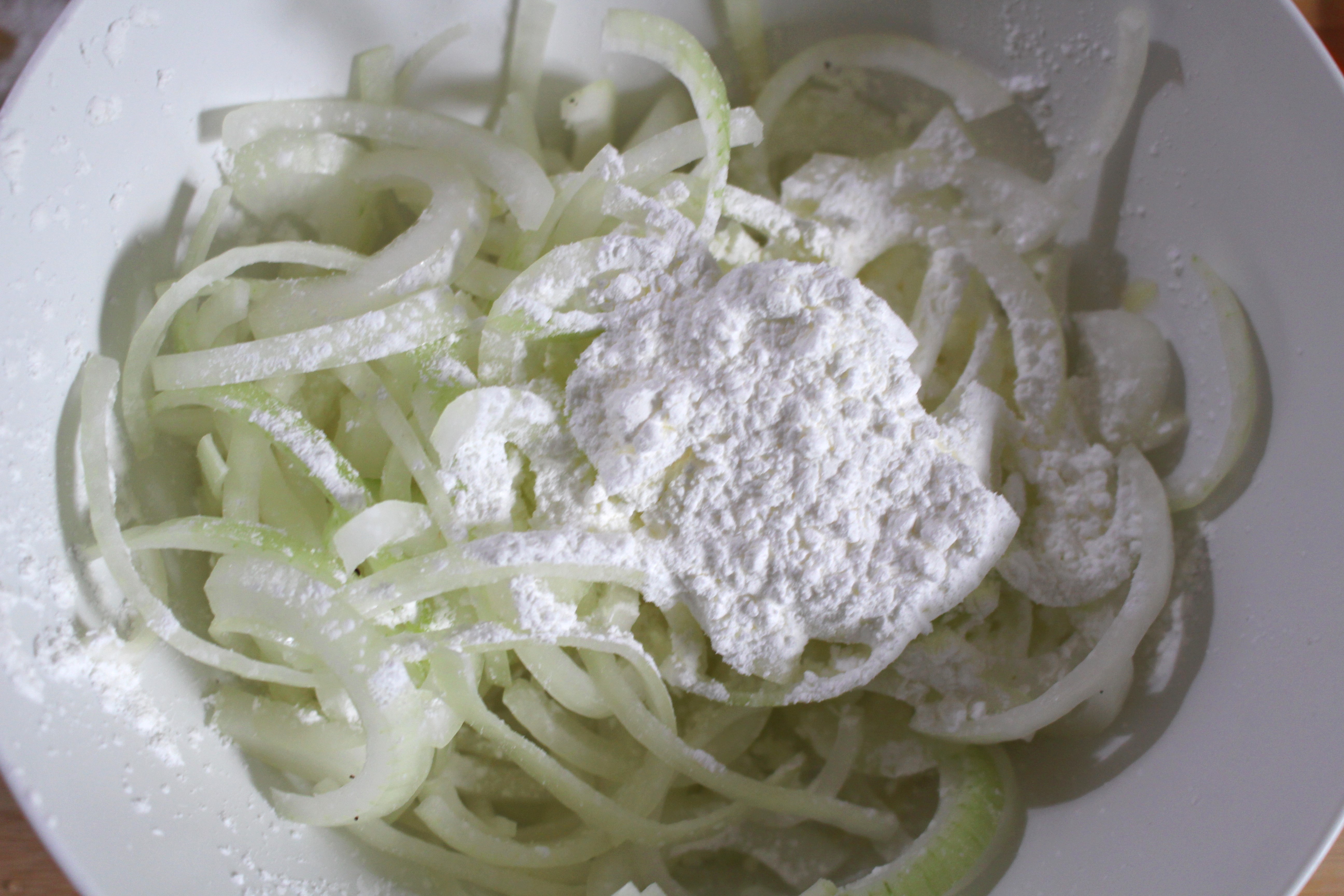 dust the onions with a/p flour, season with kosher salt and cayenne pepper to taste
