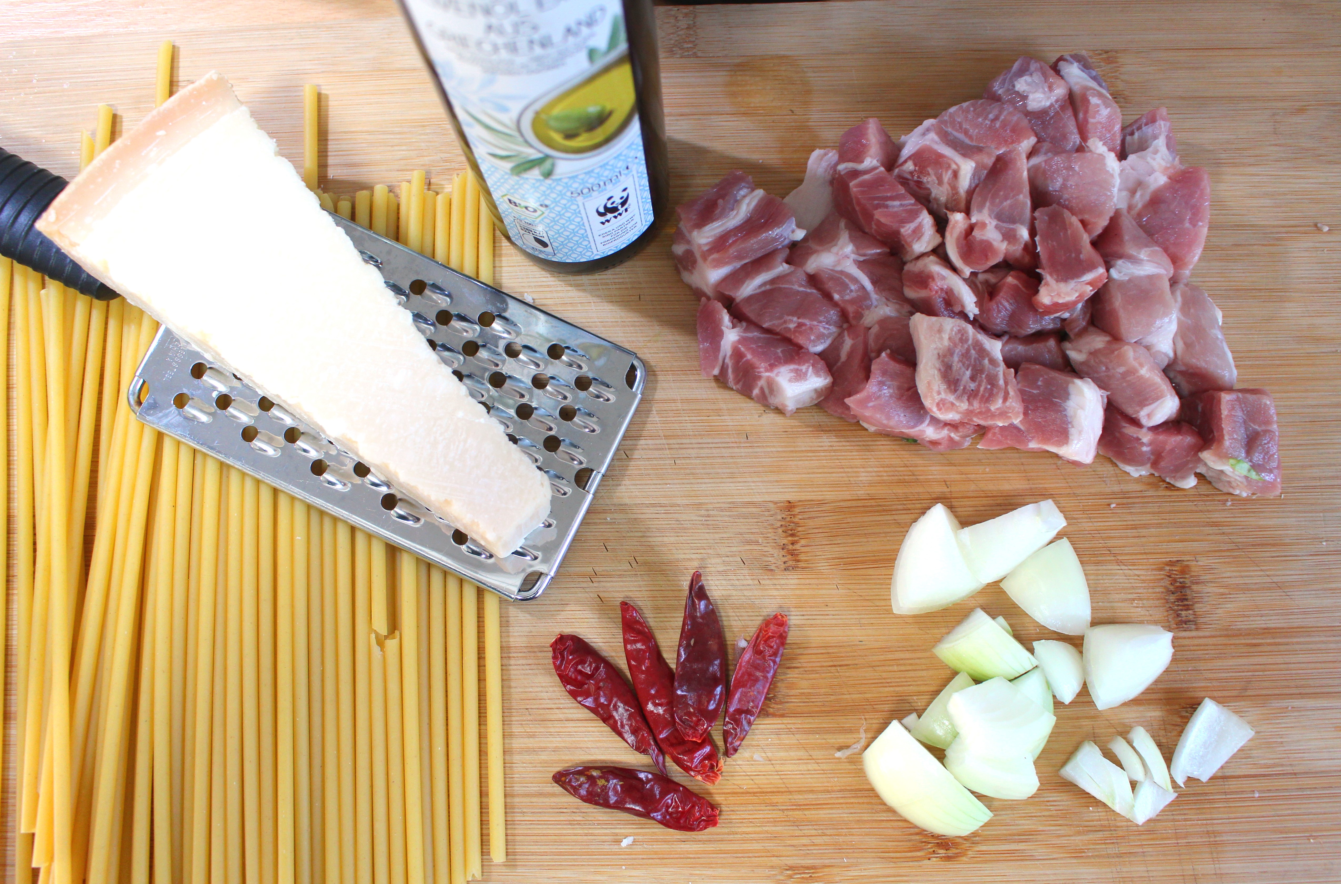Around The World In 20 Minutes – Pork Neck Steak, Chilies, Onions And Bucatini With Herbs And Parmigiano Reggiano Next → 1 lb pork neck steak, cubed, seasoned with kosher salt and cayenne pepper to taste