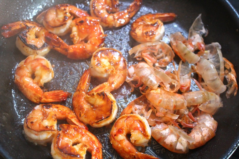 stir-fry in 2 tblsp very hot peanut oil until tigers are nearly cooked through, remove tigers, drizzle with lemon or lime juice (finish Bellas portion according to the instruction below)