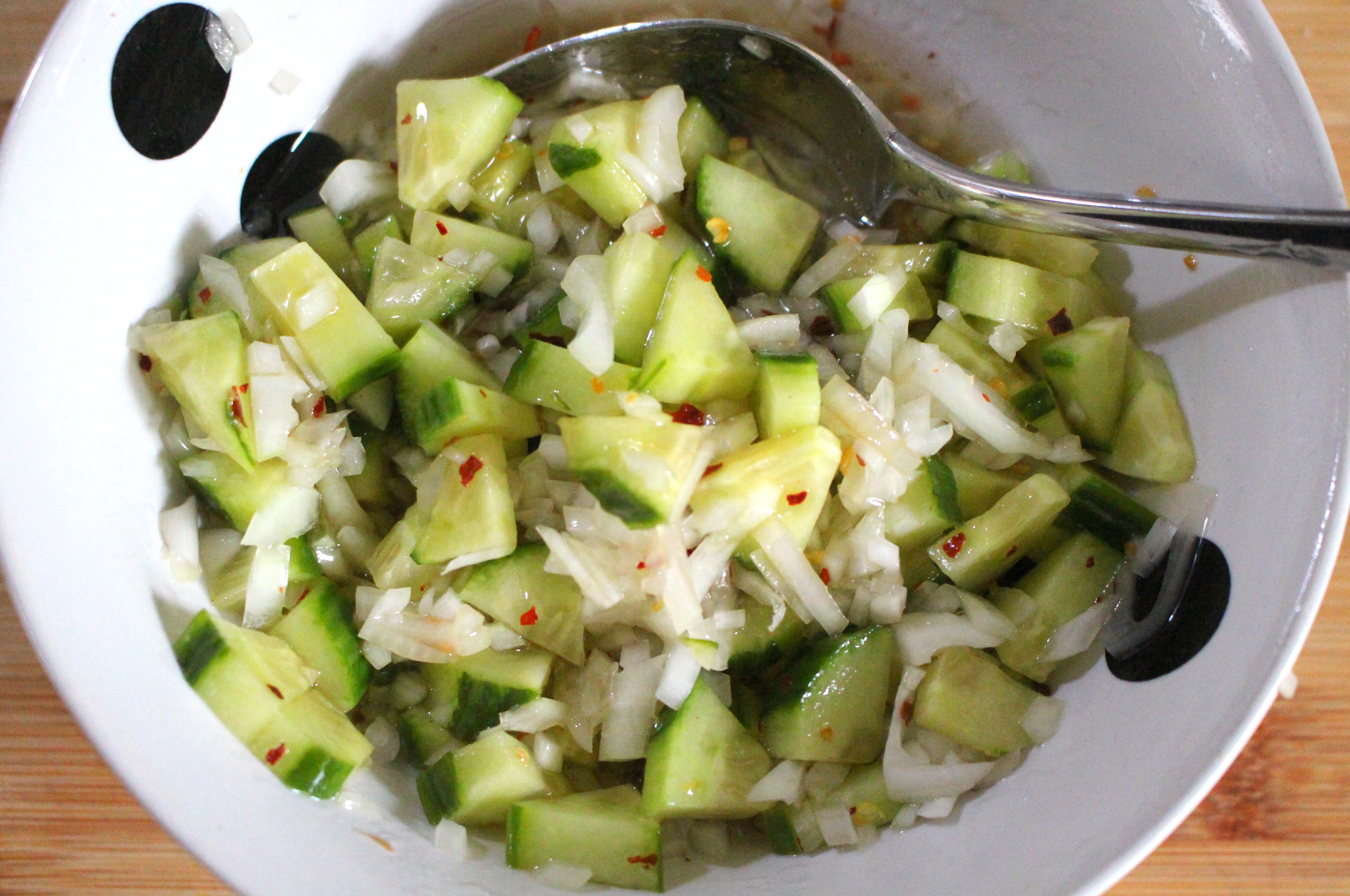for the salsa, mix 1/2 cup diced cucumbers with 1 tblsp chopped onions, 1 tblsp cilantro, chili flakes, garlic paste, kosher salt and lime or lemon juice to taste