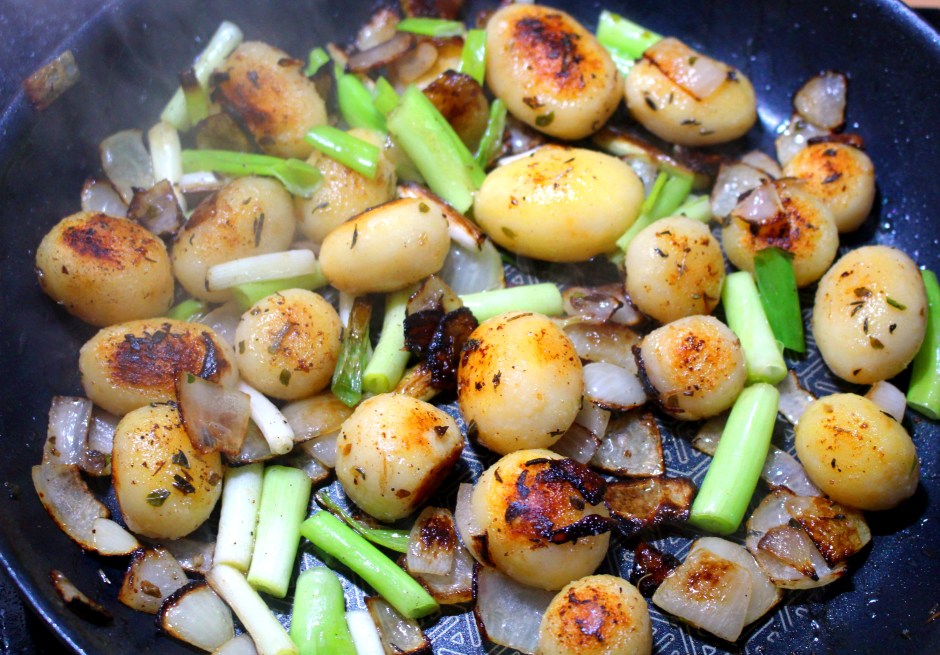 Sautéed Cubed Striploin Steak, With Potatoes, Carrots & Onions ← Previous Next → when browned, add 1/2 cup 1 inch scallions, saute another minute