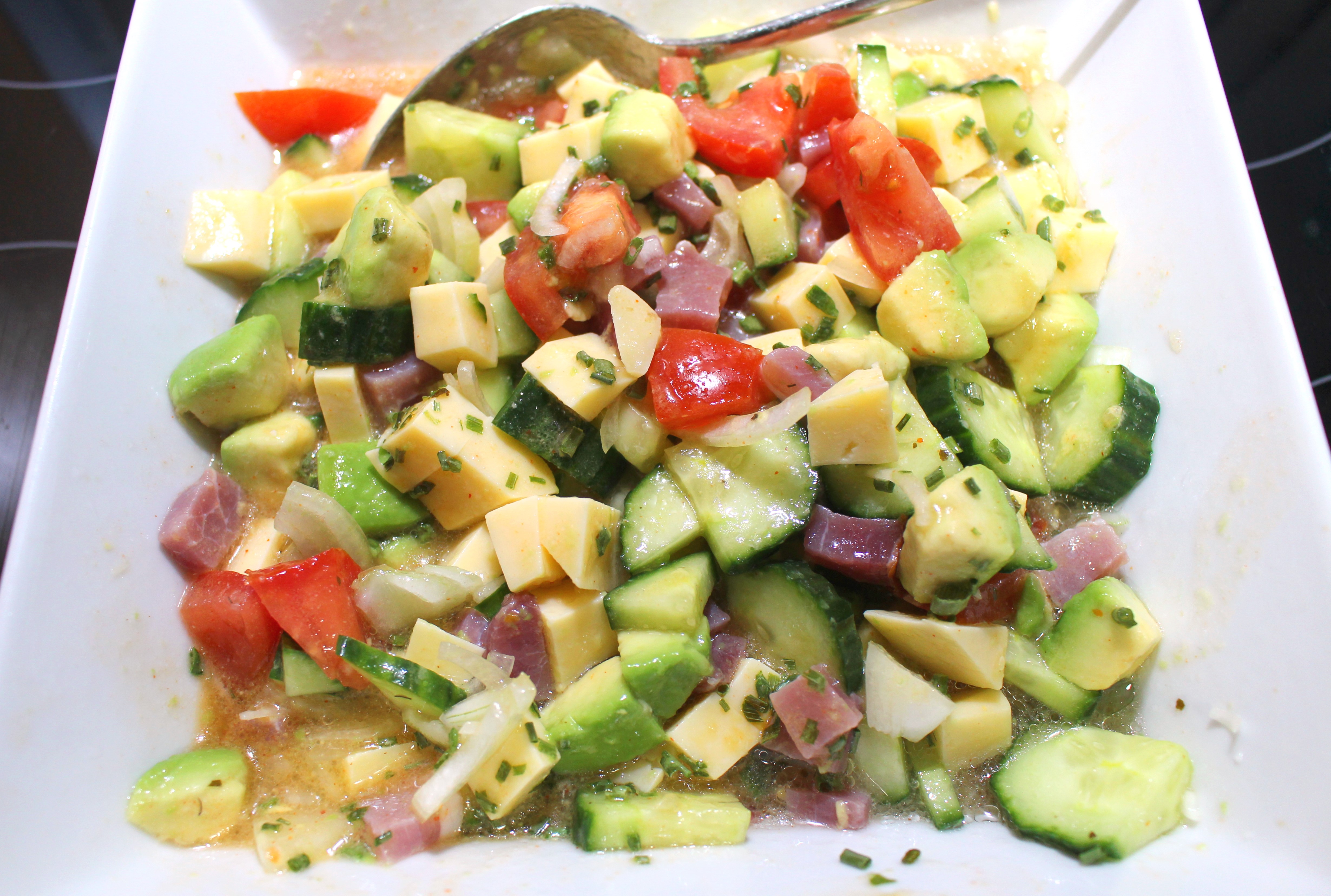 Salad Of Smoked Beef, Gouda, Egg, Avocado, Cucumber And Tomato In Herb Vinaigrette, Served With Taralli ← Previous Next → add 1/2 cup herb-vinaigrette