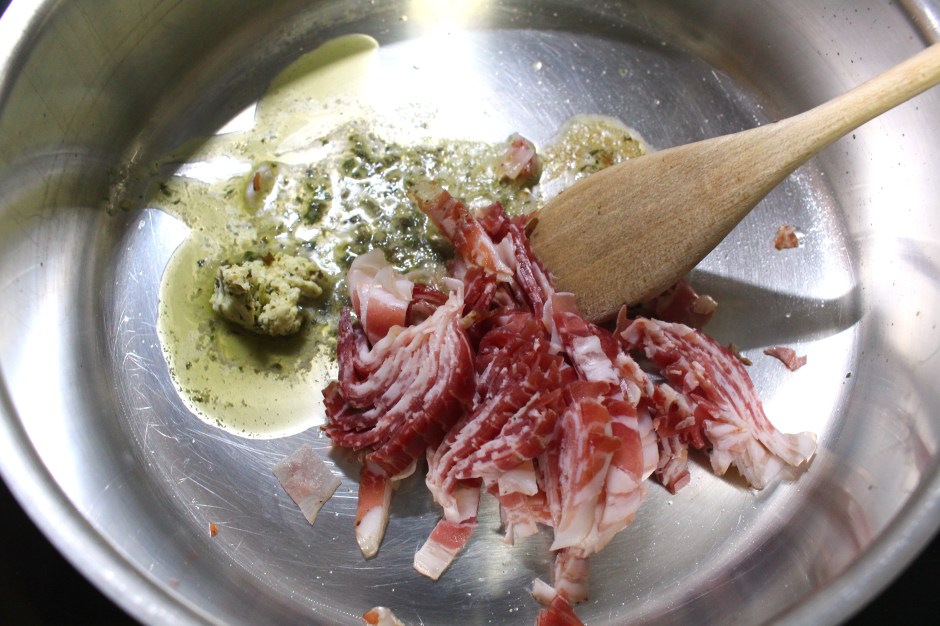 Kalbs Haxe, Semmelknödel, Und Rosenkohl Mit Speck… (Whole-Roast Veal Shank, Brussels Sprouts And Bread Dumplings) ← Previous Next → saute 4 oz of sliced bacon in 2 oz garlic/herb butter