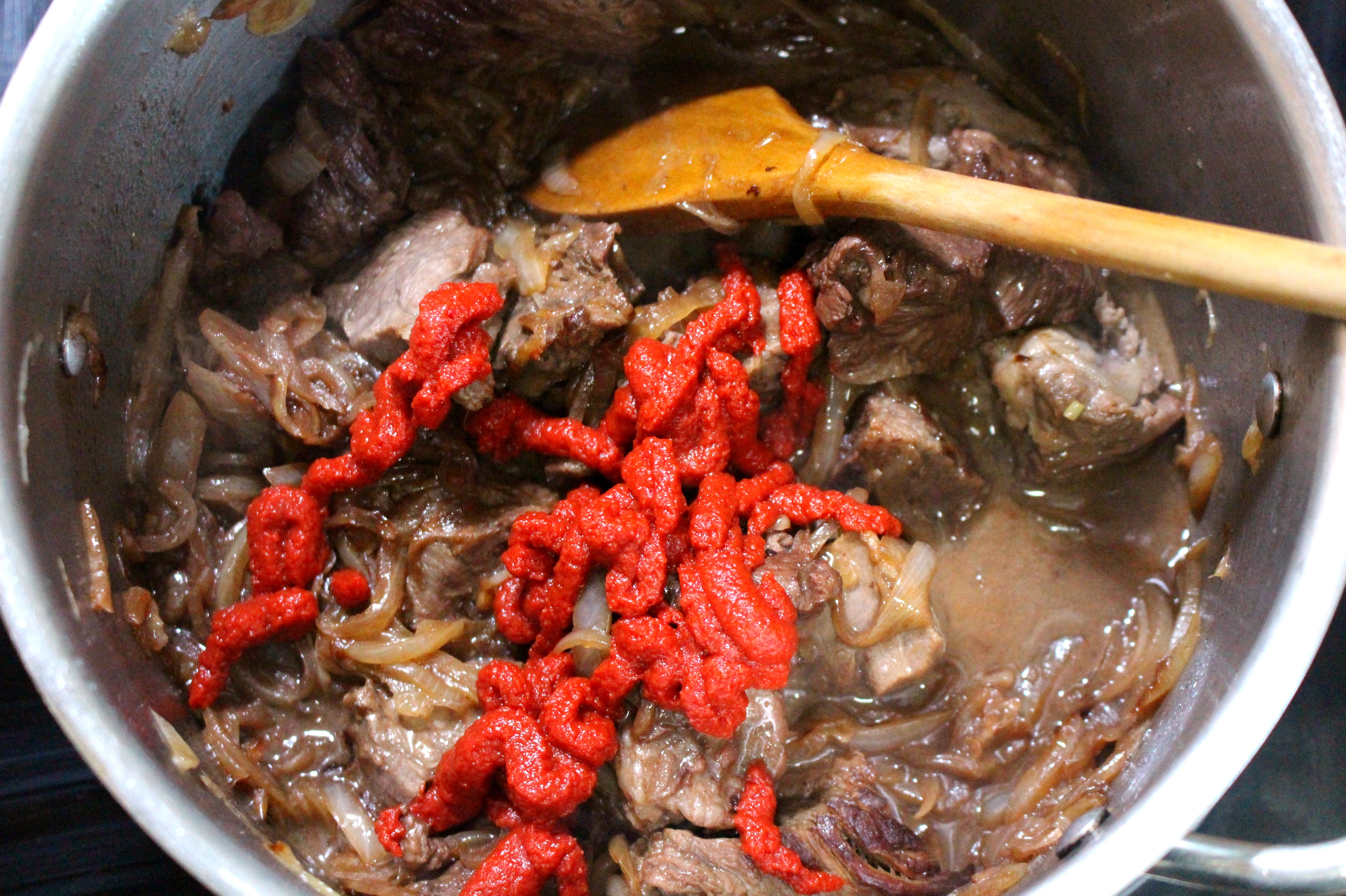 Beef Goulash & Bread Dumplings ← Previous Next → add 2 tblsp tomato paste, saute until lightly caramelized