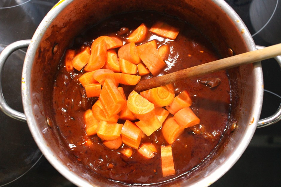Beef Goulash & Bread Dumplings ← Previous Next → simmer until meat is almost tender and stock thickened, about 1 1/1 to 2 hours, depending on the meat, add 1 cup sliced or diced raw carrots