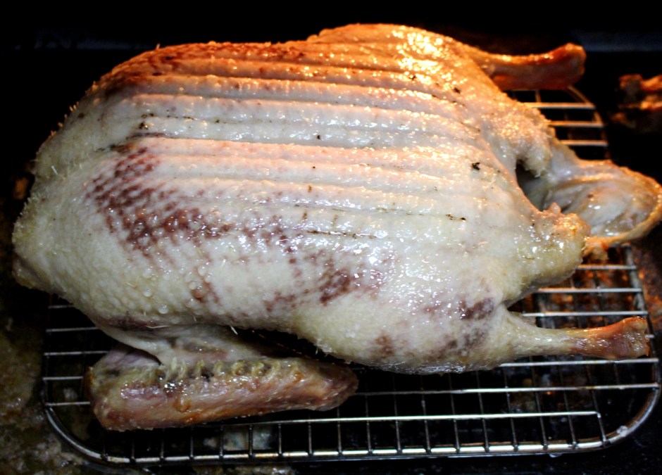 after 3 H/45 M, turn the temperature to 420F (215 C) remove the duck with the rack to another tray (I used a cast Iron pan) roast breast-side up for another 20 to 30 minutes or until the skin is very crisp and golden brown, remove from oven and let rest for 10 Minutes before carving