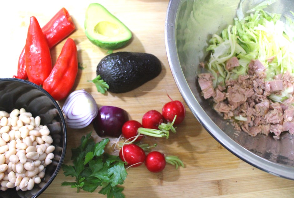 Easy Does it # 39 – “Tuna Salad” ← Previous Next → 1 cup sliced iceberg,1 cup cooked white beans, 1 cup canned tuna, 1 ea diced avocado, 3 ea med chilies, whole; 5 ea red radishes, thinly sliced; 1/4 cup cilantro, chopped; 1 ea medium size red onion, julienned