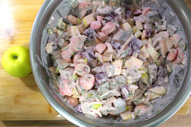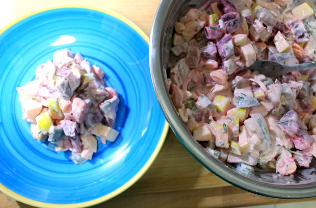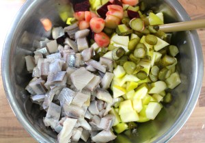 Pls note that I did not include measurements – let the ratio be guided by your preferences – more or fewer veggies, herring, yogurt, mayo, and so forth – and eliminate any of the ingredients which you don´t like.  🙂