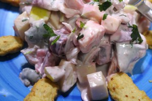 However, because of this worldwide spreading of cuisines,  most folks have had the pleasure to taste Scandinavian herring salad in one form or another, either in a restaurant or at home, sourced in a small plastic container at the neighborhood supermarket. These come in many different flavors and colors – with fresh dill, fresh chives, potatoes, red beets, cucumbers, pasta, capers, pickles of any type, apples, oranges, eggs, with matjes herring or salt herring, even with added sausage, etc, etc.