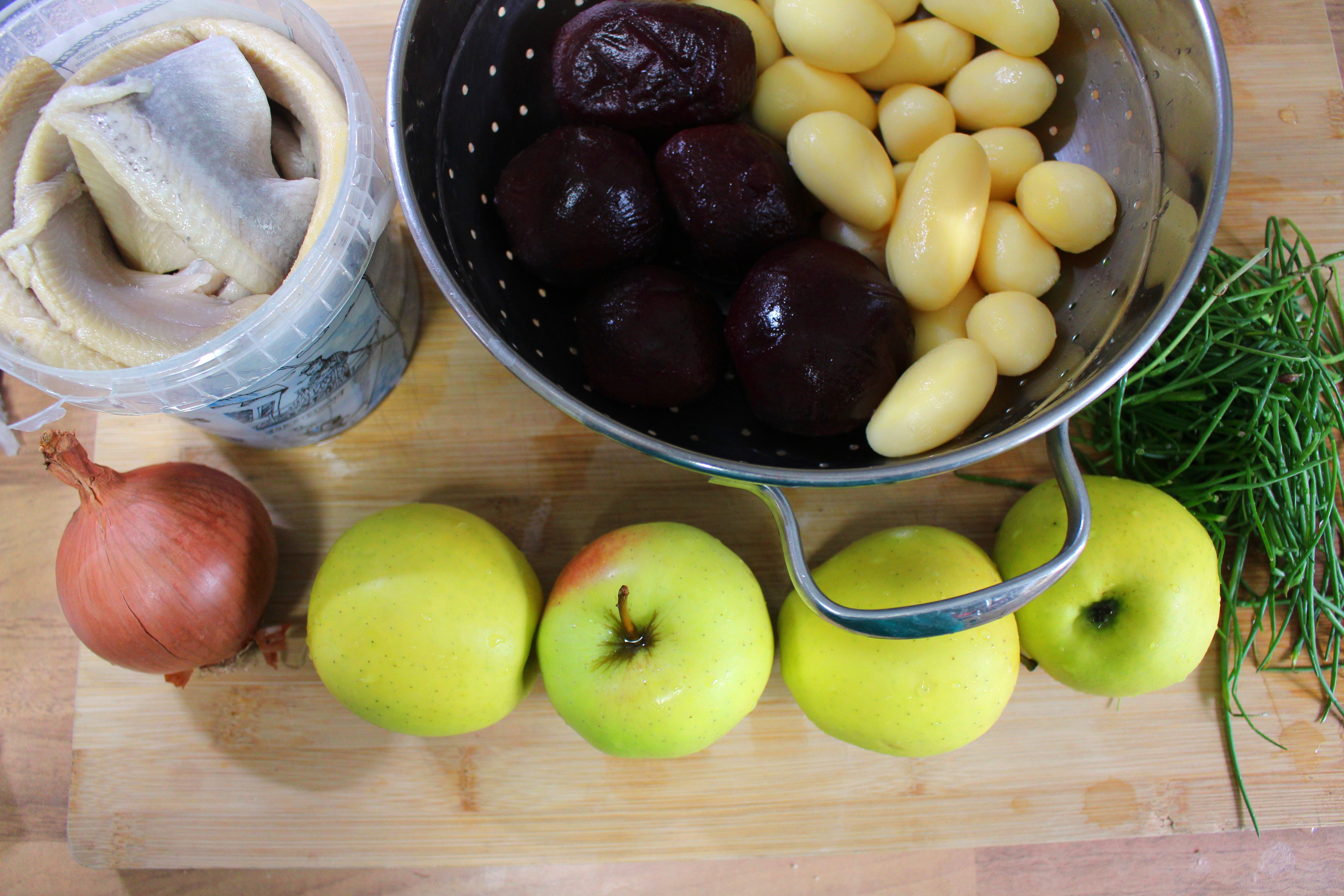 salted herring, apples, cooked red beets, cooked potatoes, onins, chivess