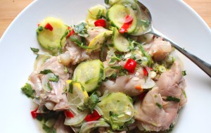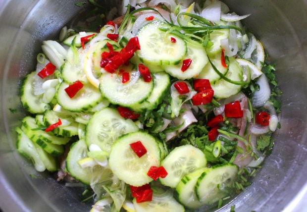 to serve, place some beluga salad on a leaf of lettuce, top with cevapcici