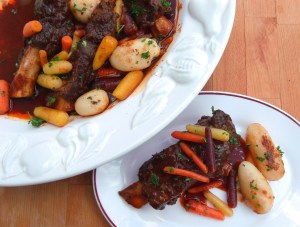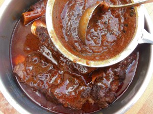 - in a large pot, add the ribs, 4 qt water, 1 lg quartered peeled onion, 4 ea med carrots, cut into lg pieces, kosher salt and grd black pepper to taste, cook until ribs are soft but NOT falling apart, remove ribs; you should have 1 qt stock remaining; meanwhile, cook 8 oz pasta of your choice (here, I used linguini)