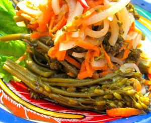 Pozole can be prepared in many ways. All variations include a base of cooked hominy in broth. Typically pork, or sometimes chicken, is included in the base. Vegetarian recipes substitute beans for the meat.