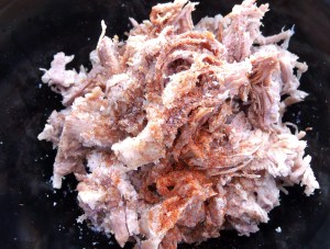 - when the meat is cooked, remove from foil, let cool until able to handle, pull into fine shreds, season with a dash of lemon juice, cayenne, kosher salt and granulated garlic to taste