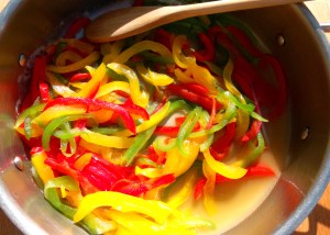 slice 1/2 ea medium size sliced onion and 1/2 ea seeded red/green and yellow peppers into julienne, saute in 2 oz whole butter until onions are translucent