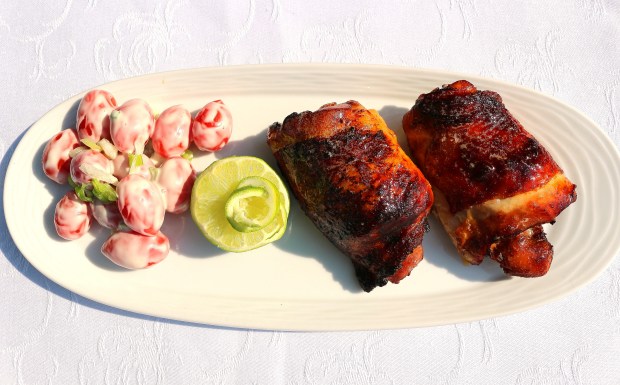 Schnitzel, both chicken and pork, is common in Namibia due to the German colonial history. A majority of the restaurants in Windhoek, Walvis Bay, and Swakopmund offer it on their menus, often topped with a fried egg and accompanied by potato salad. It is often eaten in a Brötchen (German sandwich roll) with tomatoes, cheese, and other dressing.
