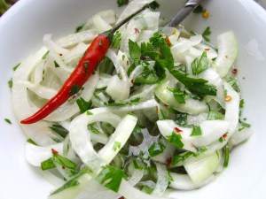 - for the salsa, mix 1/2 cup diced cucumbers with 1 tblsp chopped onions, 1 tblsp cilantro, chili flakes, garlic paste, kosher salt and lime or lemon juice to taste