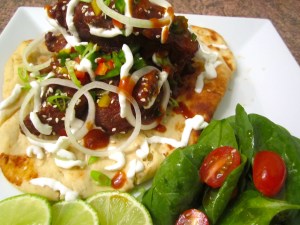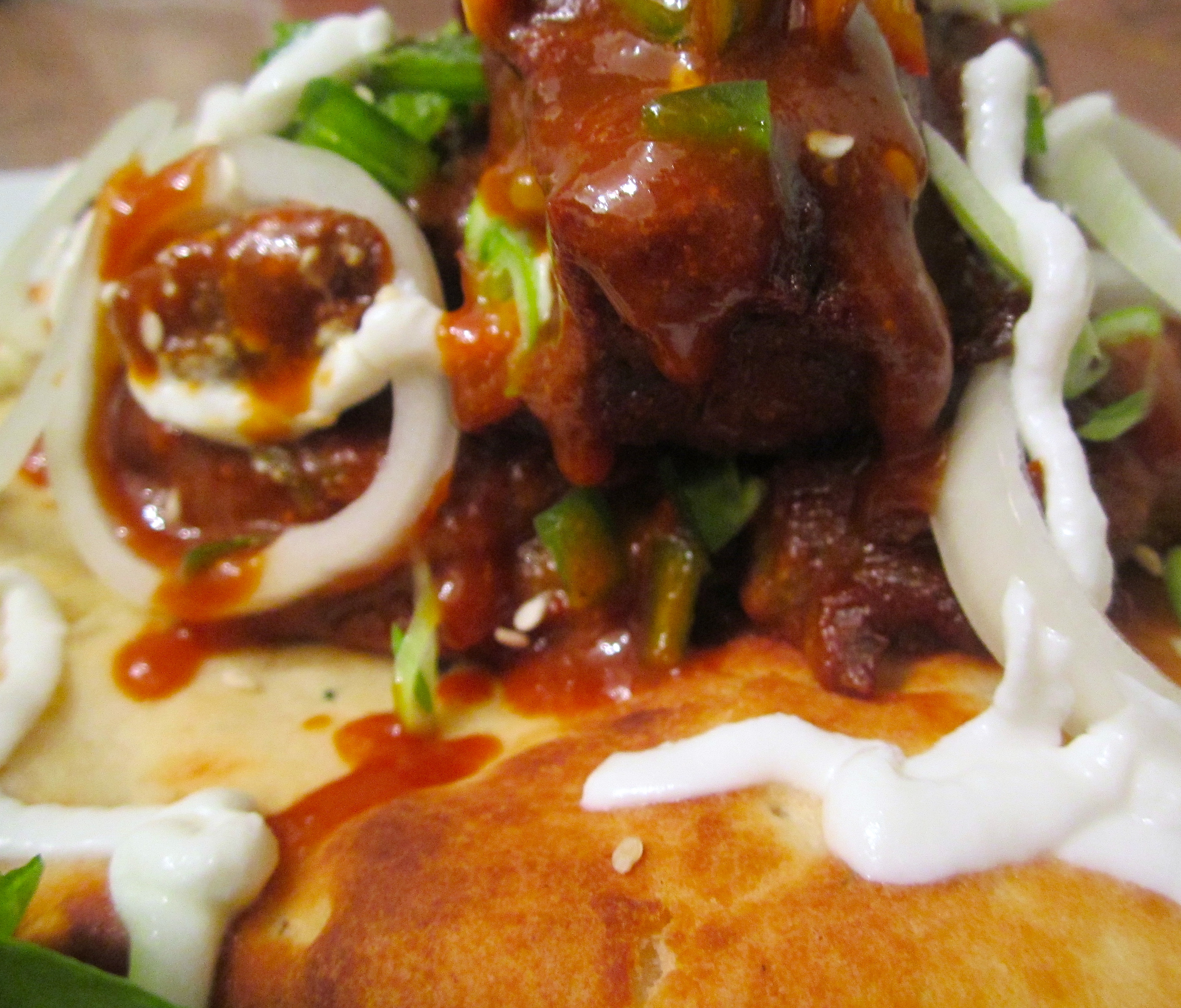 Arrange rib meat on hot naan, drizzle with yoghurt, add onion rings,