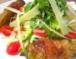 Prep a small salad with arugula, grape tomatoes, shaved asiago cheese, onions and raspberry  vinaigrette.