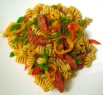 Today I prepared one of the hybrids of curried garbanzos I make on hot days – curried garbanzo salad, this time wrapped in sun dried tomato wraps.